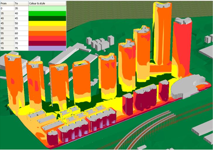 首先我们对项目所在地周边地铁、道路声源及其他噪声源进行调查、监测,借助应用GIS系统建立声场模型,运用噪声模拟软件,考虑地铁行驶速度、道路车流量以及设计车速等影响参数,绘制地铁噪声、道路噪声和其他噪声源噪声地图。根据噪声地图分析判断哪一类噪声源影响最大。通过噪声模拟软件,叠加各类噪声源进行综合评估,分析暴露在各噪声等级下的区域面积、人群数量和相应声环境质量标准的达标情况,预测项目建成后的声环境质量,绘制预测噪声地图(图1),分析新建房产项目的声环境质量情况。