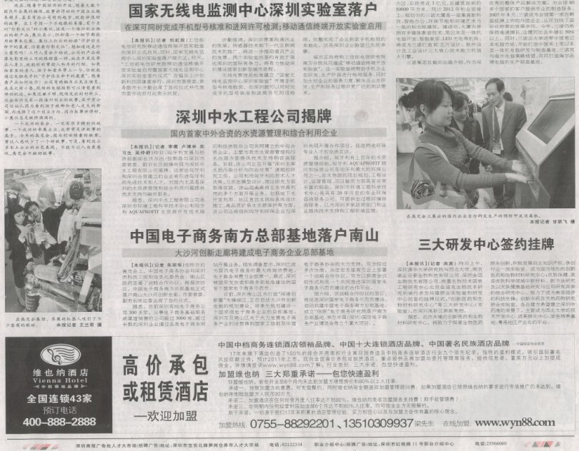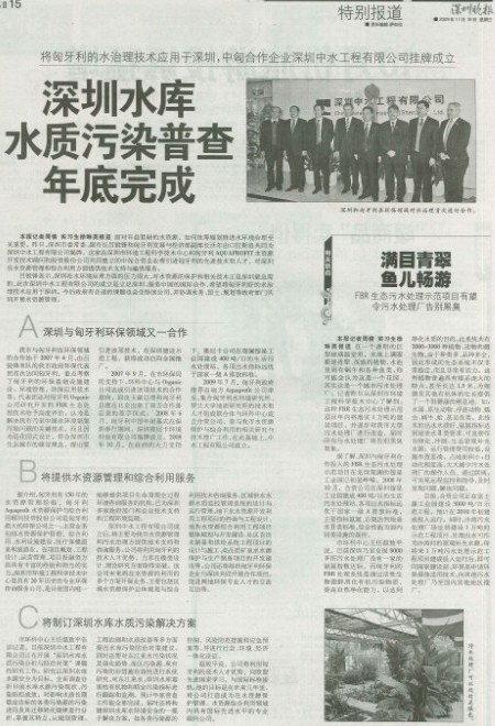 2009年11月18日下午,由我中心与匈牙利最大的环保公司AQUAPROFIT公司合作建立的深圳中水工程有限公司宣告成立,深圳市委常委、副市长吕锐锋与匈牙利发展与经济部副部长沃尔由•拉斯洛为中水公司成立揭牌。