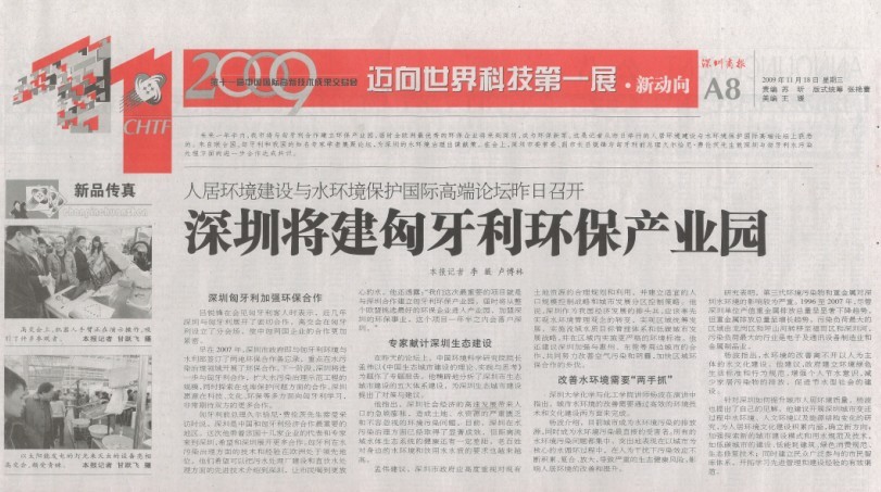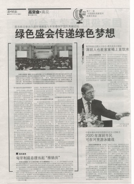 2009年11月18日上午,人居环境建设与水环境保护国际高端论坛在深圳五洲宾馆召开,我中心中水工程有限公司匈方高级顾问、匈牙利AQUAPROFIT公司高级经理、阿提拉•高乔戈先生和我中心奥尼卡合资公司匈方总顾问、匈牙利ORGANICA生态技术股份有限公司总裁、伊斯特万•凯涅来西先生分别在论坛上发言。