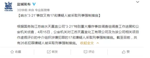 根据国务院江苏响水天嘉宜公司“3·21”特别重大爆炸事故调查组调查工作进展和公安机关侦查,4月15日,公安机关对江苏天嘉宜化工有限公司及为该公司相关项目作虚假评价的中介组织涉嫌犯罪的17名嫌疑人采取刑事强制措施。截至目前,共有26名犯罪嫌疑人被采取刑事强制措施。
