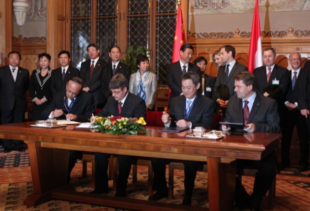 国家副主席习近平和匈牙利总理鲍伊瑙伊共同出席了双方合作文件的签字仪式。